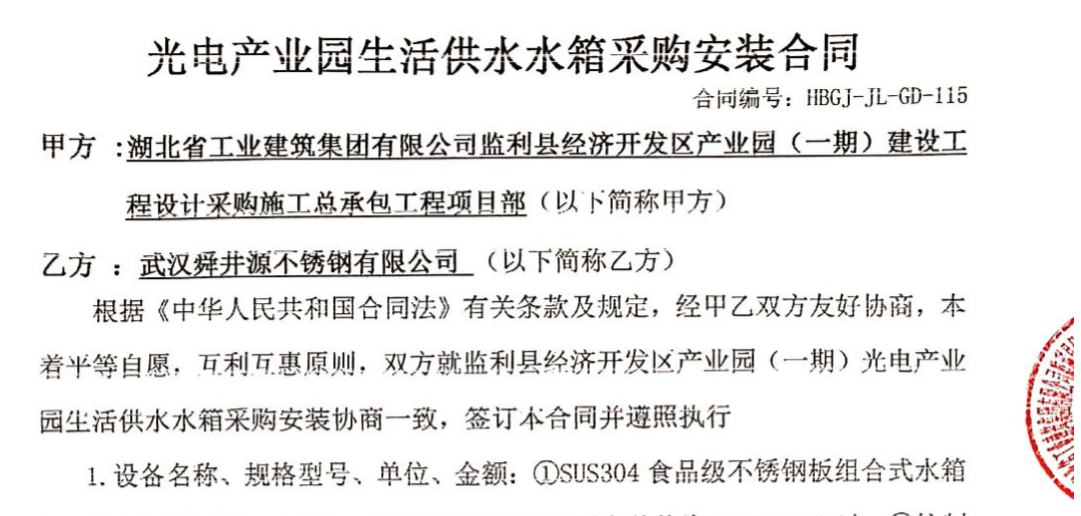 2019年4月3日,湖北省工業(yè)建筑集團(tuán)有限公司將監(jiān)利縣經(jīng)濟(jì)開發(fā)區(qū)產(chǎn)業(yè)園(一期)建設(shè)工程不銹鋼水箱轉(zhuǎn)包給我公司,并于湖北省工業(yè)建筑集團(tuán)有限公司簽訂《不銹鋼水箱定制安裝合同》。湖北工業(yè)建筑要求我公司按合同所提供的貨物是優(yōu)質(zhì)的,符合本類產(chǎn)品國家技術(shù)標(biāo)準(zhǔn)和質(zhì)量要求,且貨物質(zhì)量必須滿足設(shè)計(jì)要求及國家、地方、行業(yè)主管部門、質(zhì)量監(jiān)督部門的有關(guān)法規(guī)及規(guī)范規(guī)定,產(chǎn)品安裝驗(yàn)收完成后付至合同總價(jià)的95%,余5%在合同質(zhì)保期滿一年后一周內(nèi)付清。我公司于2019年4月15號按時(shí)完成施工,并于后一日一次性驗(yàn)收合證。