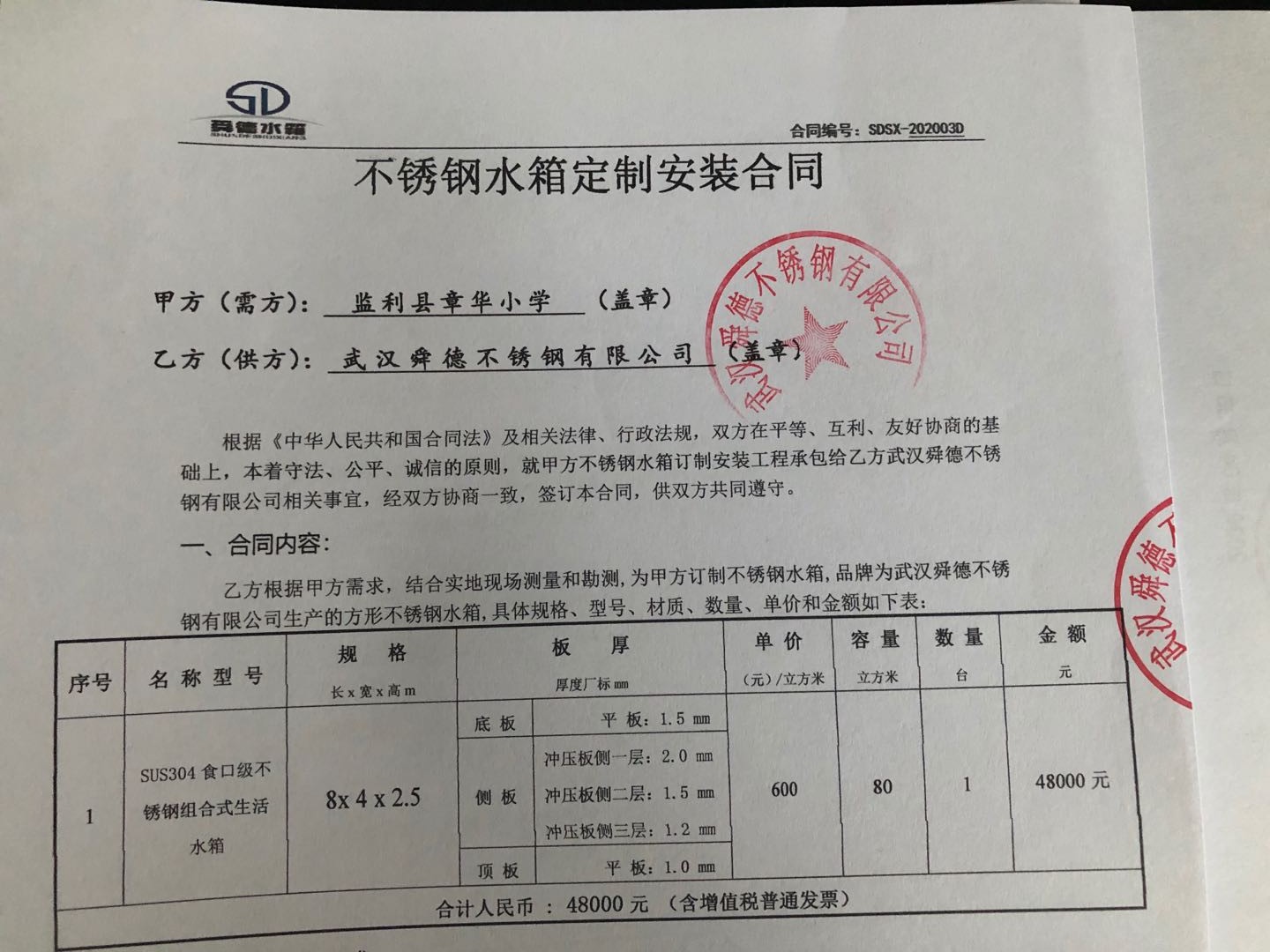板材厚度采用底板1.5mm,側一2.0mm,側二1.5mm,側三1.2mm,頂板1.0mm,以及40*40不銹鋼拉筋,內外不銹鋼爬梯,底部要求甲方制作鋼筋混凝土水泥基礎或水泥平臺(負差不超過5°),用來承受水箱的壓力,避免土地塌陷。